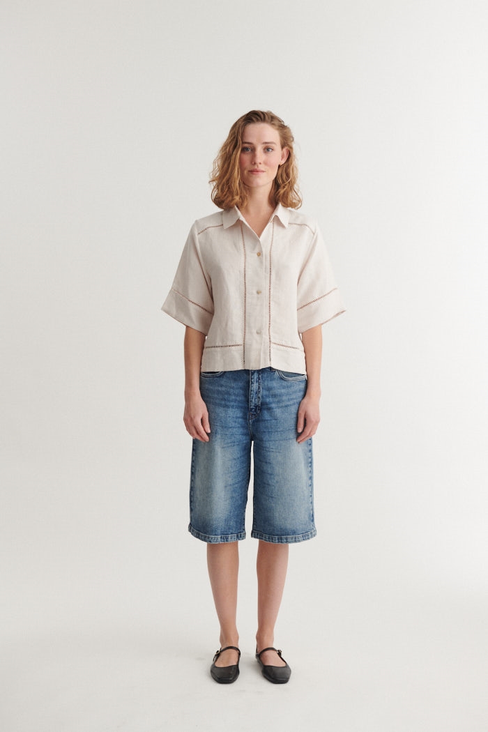 Arina SS Shirt er den perfekte lette sommerskjorte med en afslappet, luftig pasform og korte ærmer, der gør den lige til at hoppe i på varme dage. Den har klassisk knaplukning og et diskret broderi på ryggen, der giver et ekstra lille touch af stil. Det letvævede materiale gør den behagelig og nem at have på – både til hverdag og ferie.