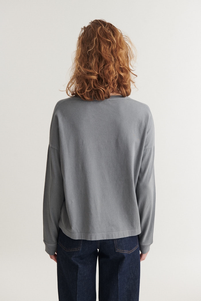 Løs pasform, rund hals, lange ærmer, ribkanter og let bomuldskvalitet.