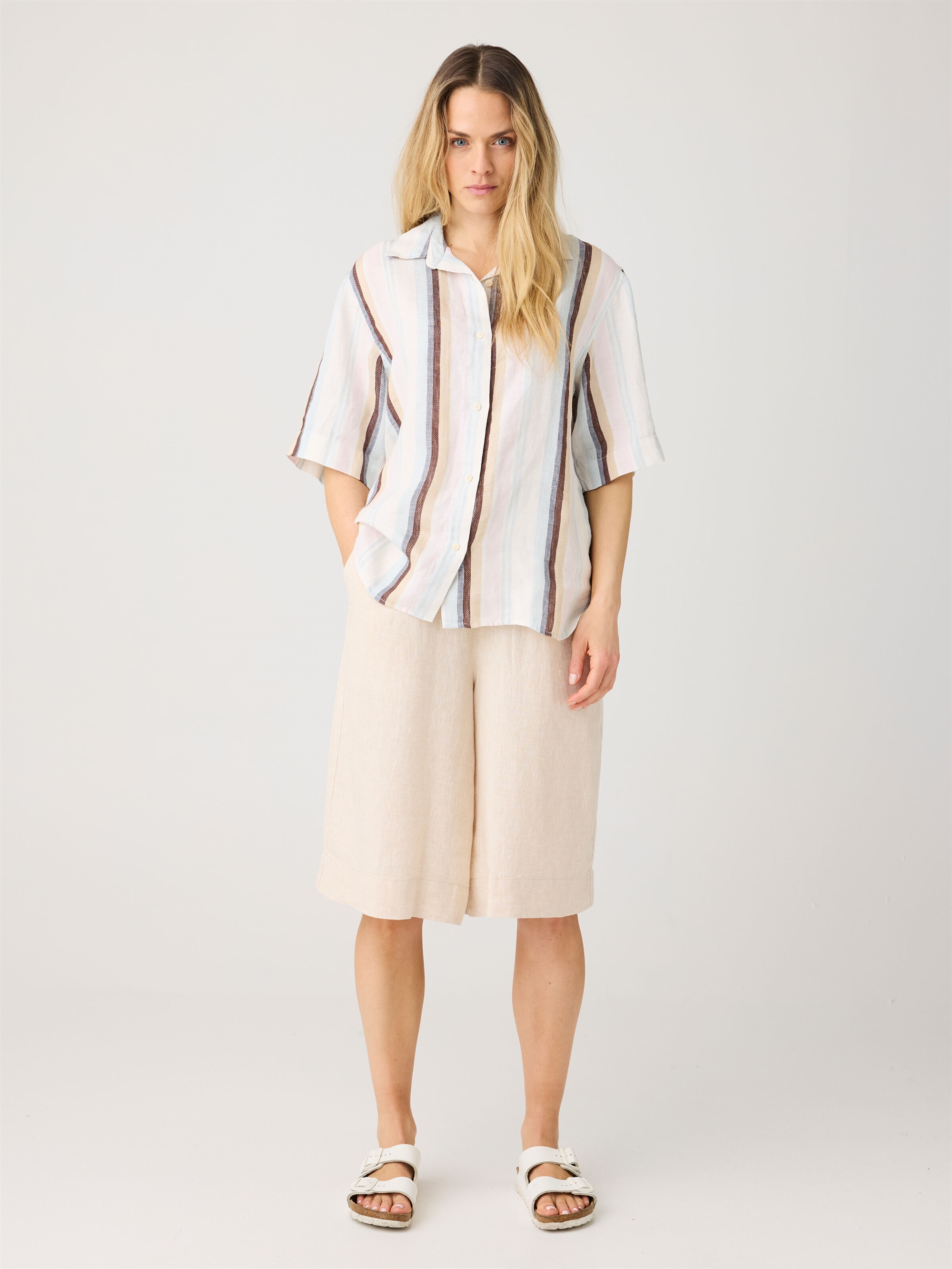 Den lette hørblanding føles luftig mod huden og giver naturlig åndbarhed, mens den elastiske talje sikrer en behagelig og fleksibel pasform. Resultatet er et par shorts, der kombinerer afslappet stil med høj komfort.