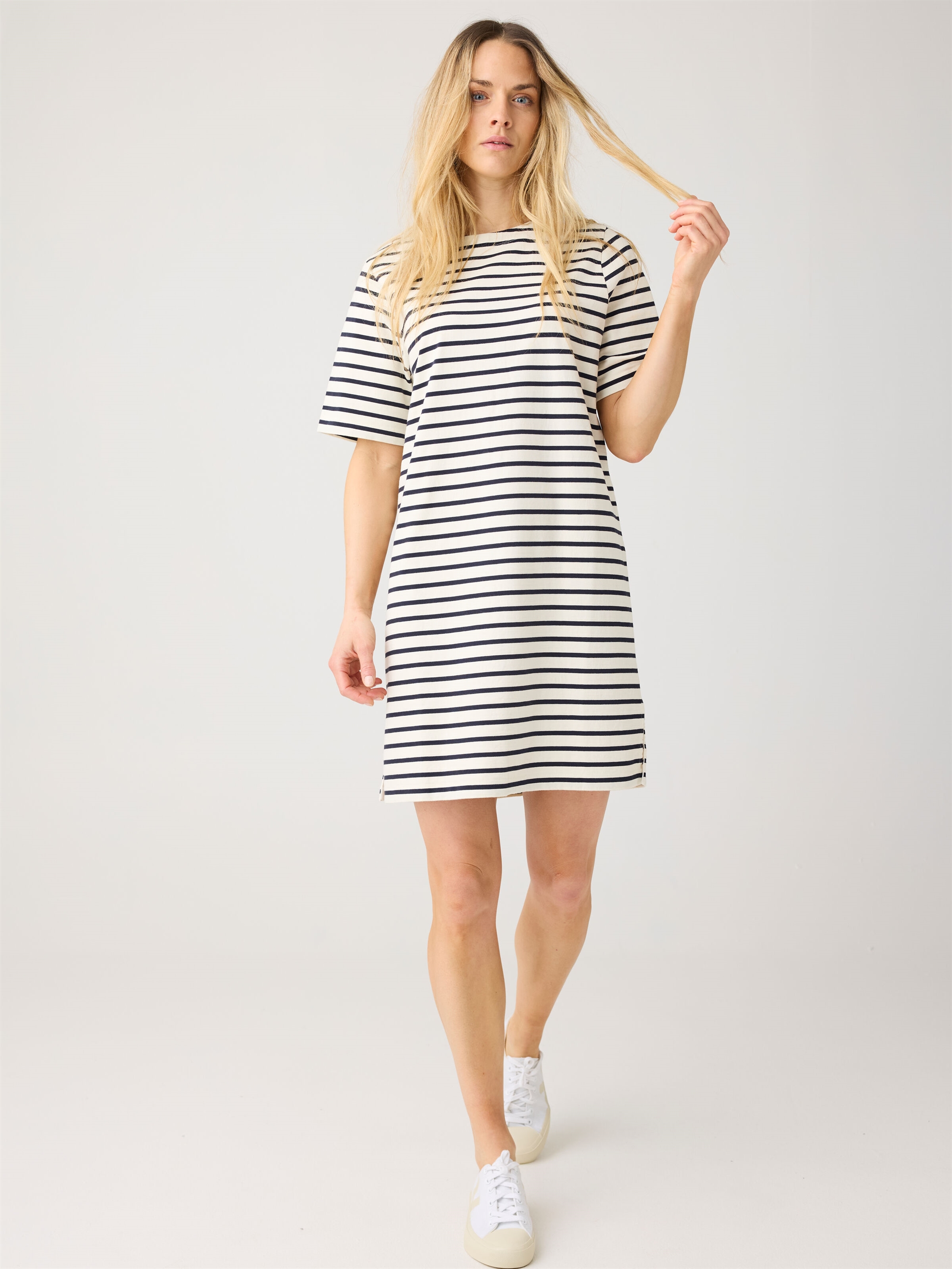 De maritime striber giver et tidløst udtryk, mens den lette kvalitet gør kjolen behagelig at have på hele dagen. En alsidig sommerfavorit, der fungerer lige godt til strandture, ferier eller afslappede dage i byen.